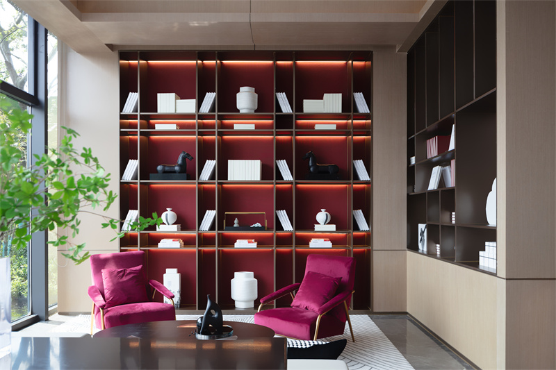 在帶有更強私密性的深度洽談區,設計師通過兩側柜體構筑起一片自成畫意的空間。大面的景觀視野、金屬線條的置物架,整個空間通透明朗,紅色的背景、座椅點綴其間,氤氳出空間的靈動、時尚的氣質。