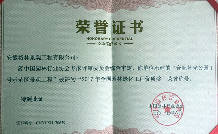 2017年6月18日,由中國園林行業協會主辦的2017中國園林綠化發展高層論壇在大連隆重開幕。會上,我司承接的“藍光公園1號示范區景觀工程”被授予“2017年全國園林綠化工程優質獎”。
